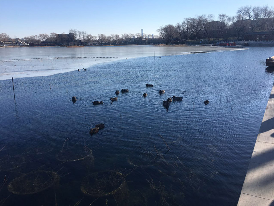 在冬季,為了確保水下擺放的大量定制荷花大瓷缸不被凍裂,在西海濕地公園沿岸安裝了22臺潛水式擾冰設備,使不結冰水面達幾萬平米,由于野生動物的到來,吸引了許多市民駐足觀賞。